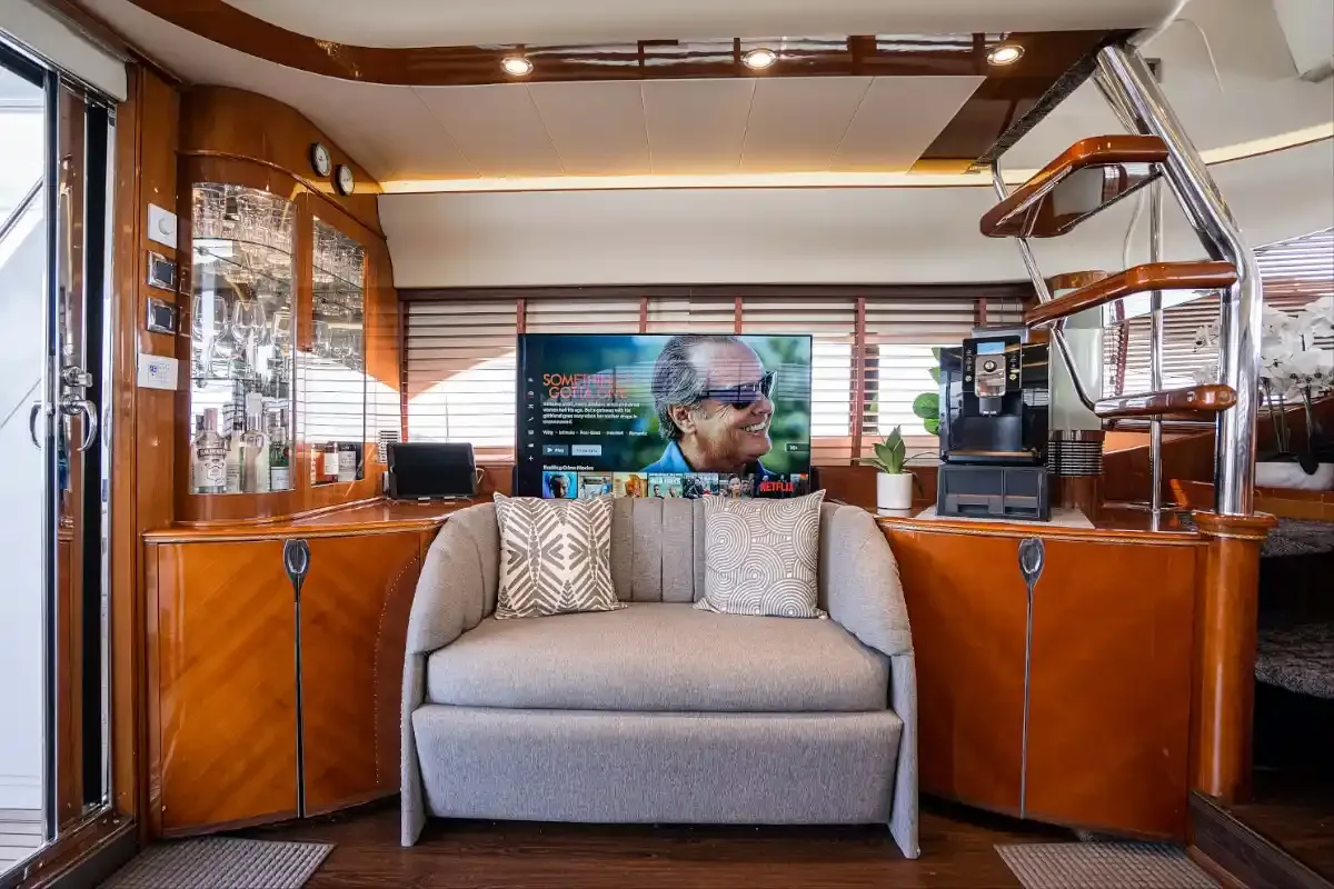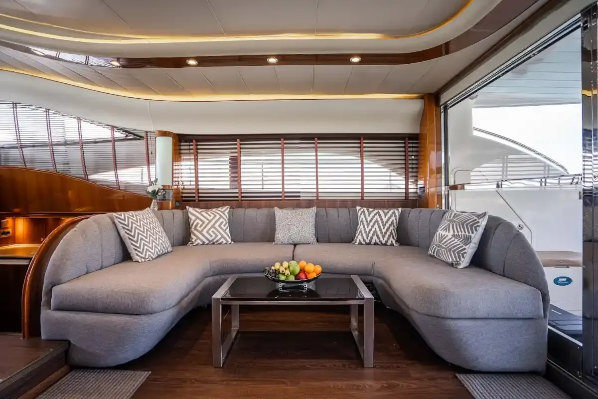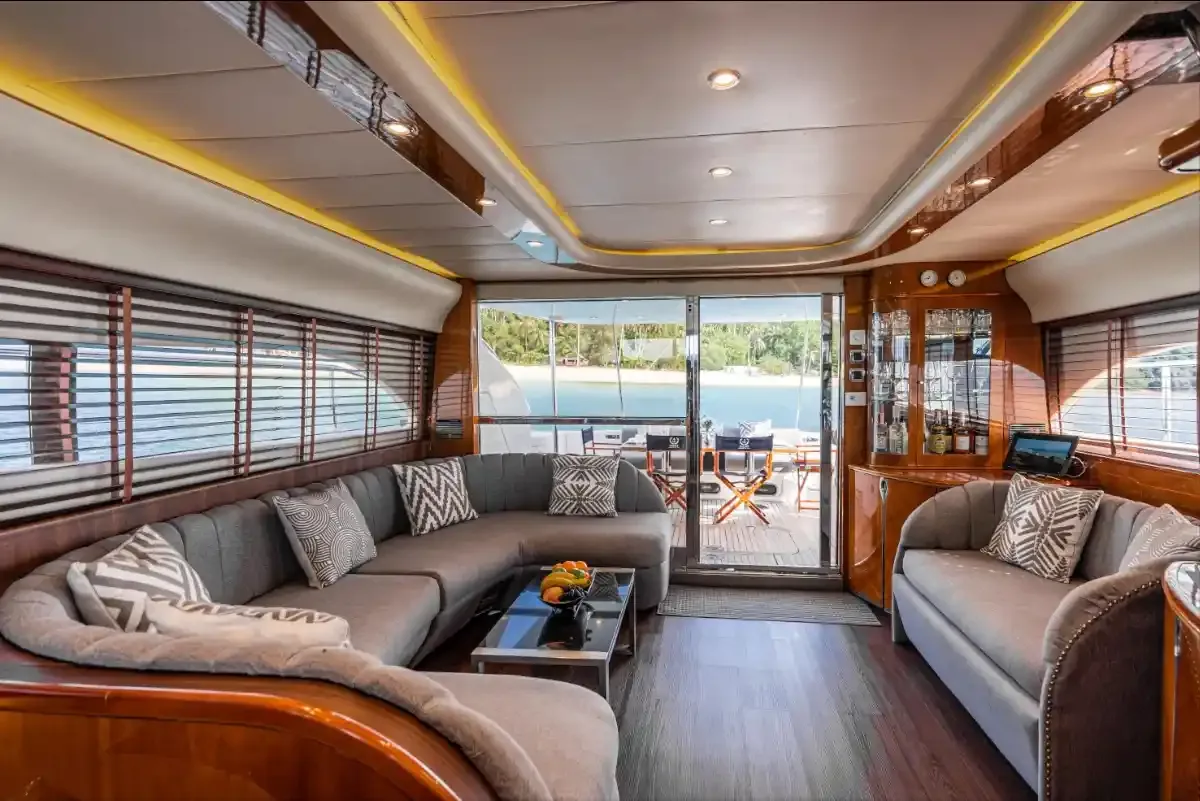 The luxurious yacht features 4 cabins, a spacious saloon and a fully equipped kitchen. The lower deck features 3 cabins with en-suite bathrooms and 1x twin cabin with bunk beds.