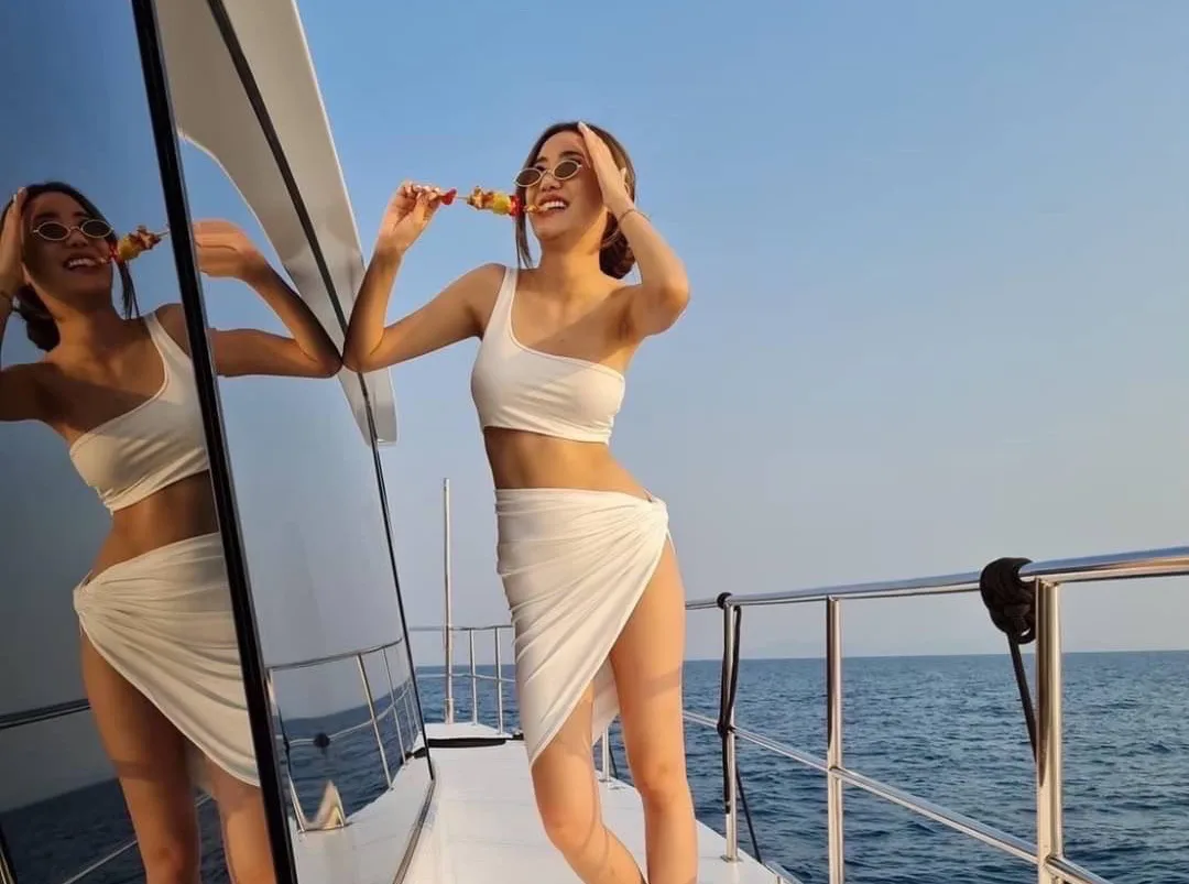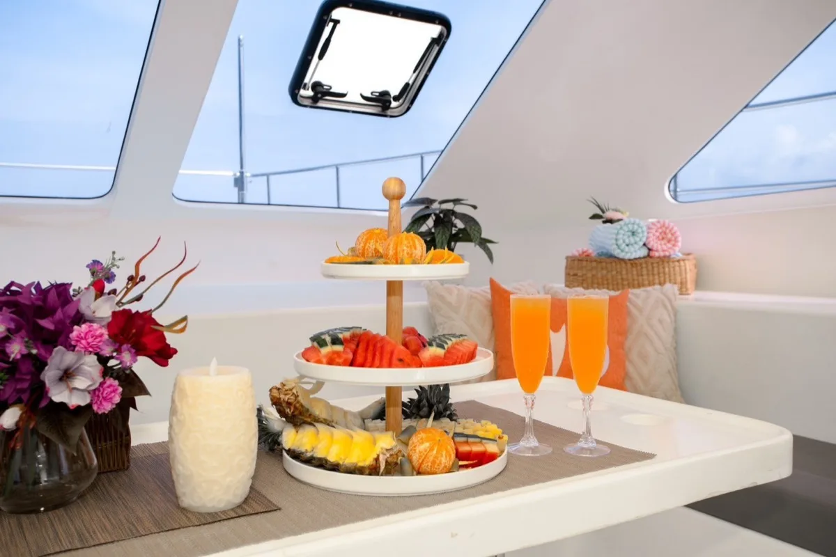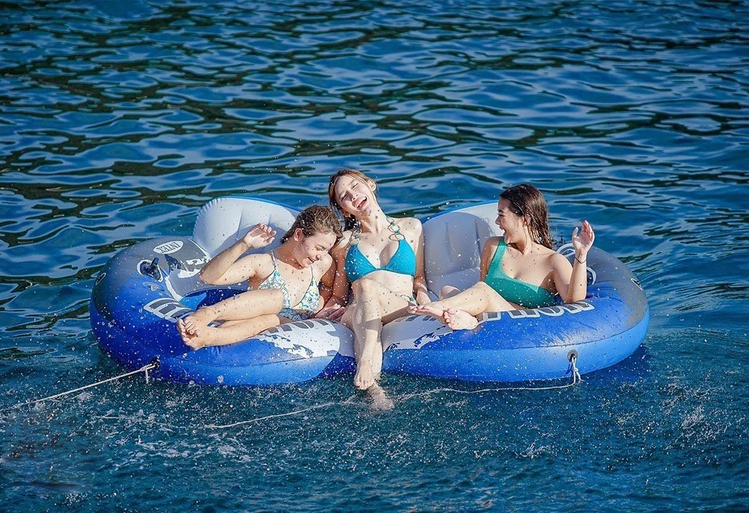 The yacht features essential amenities including a sound system, kitchen facilities, and practical water activities with water slide, floating pool, kayak, stand-up paddleboard, fishing gear, and snorkeling equipment.