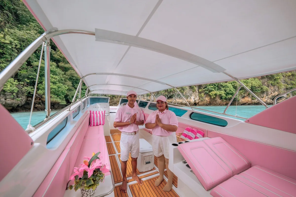 This rental speedboat in Krabi looks a bit like a Barbie vehicle, but has a lot of power built in and takes groups of up to 20 people comfortble to the most beautiful destinations in the Andaman Sea in the shortest possible time. Best service included!