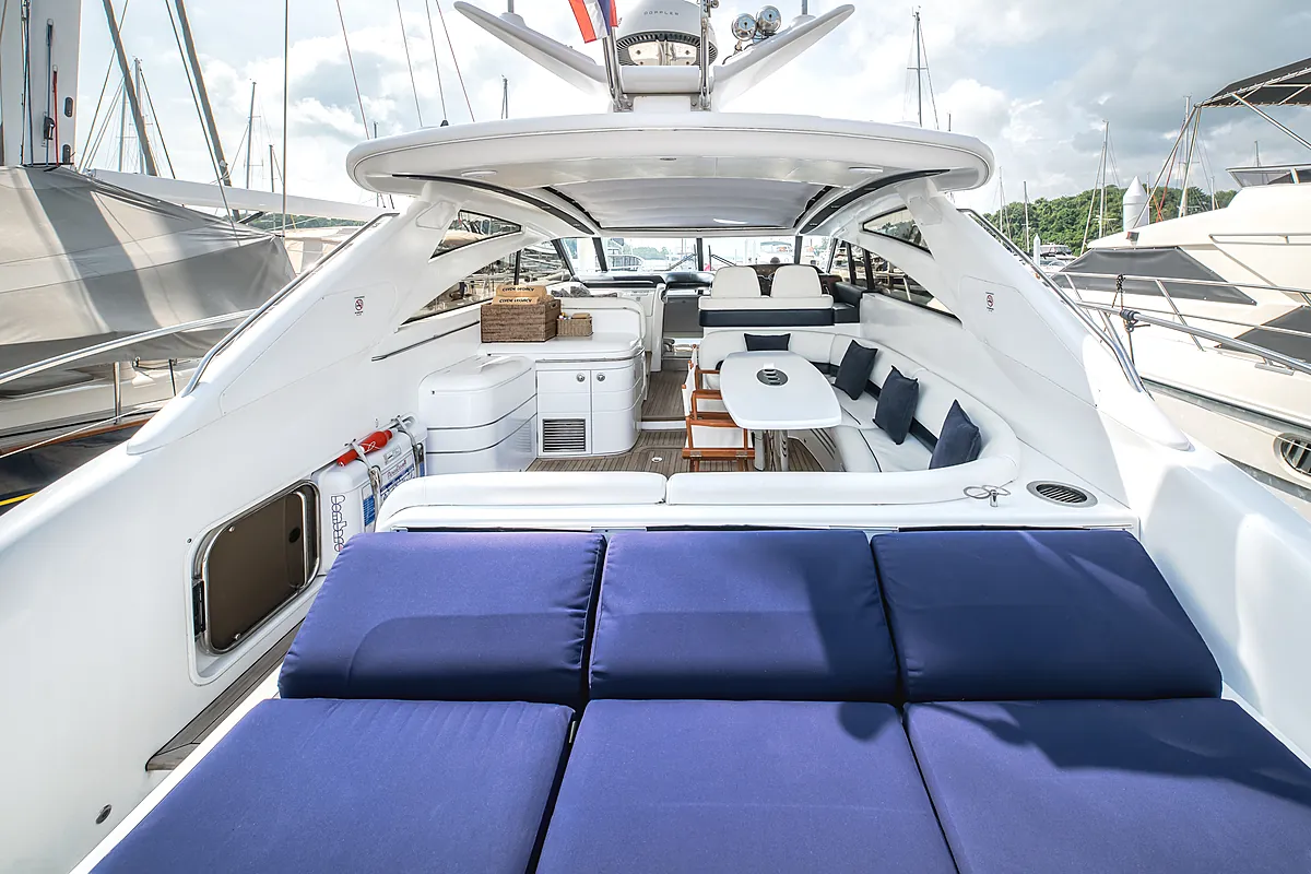 Experience luxury aboard Bonnie, our renowned 2018 Princess V58 for charter in Phuket. Accommodating up to 17 guests, this sleek and sportive yacht cruises at a swift 17 knots, perfect for island hopping adventures in Phuket's stunning waters!