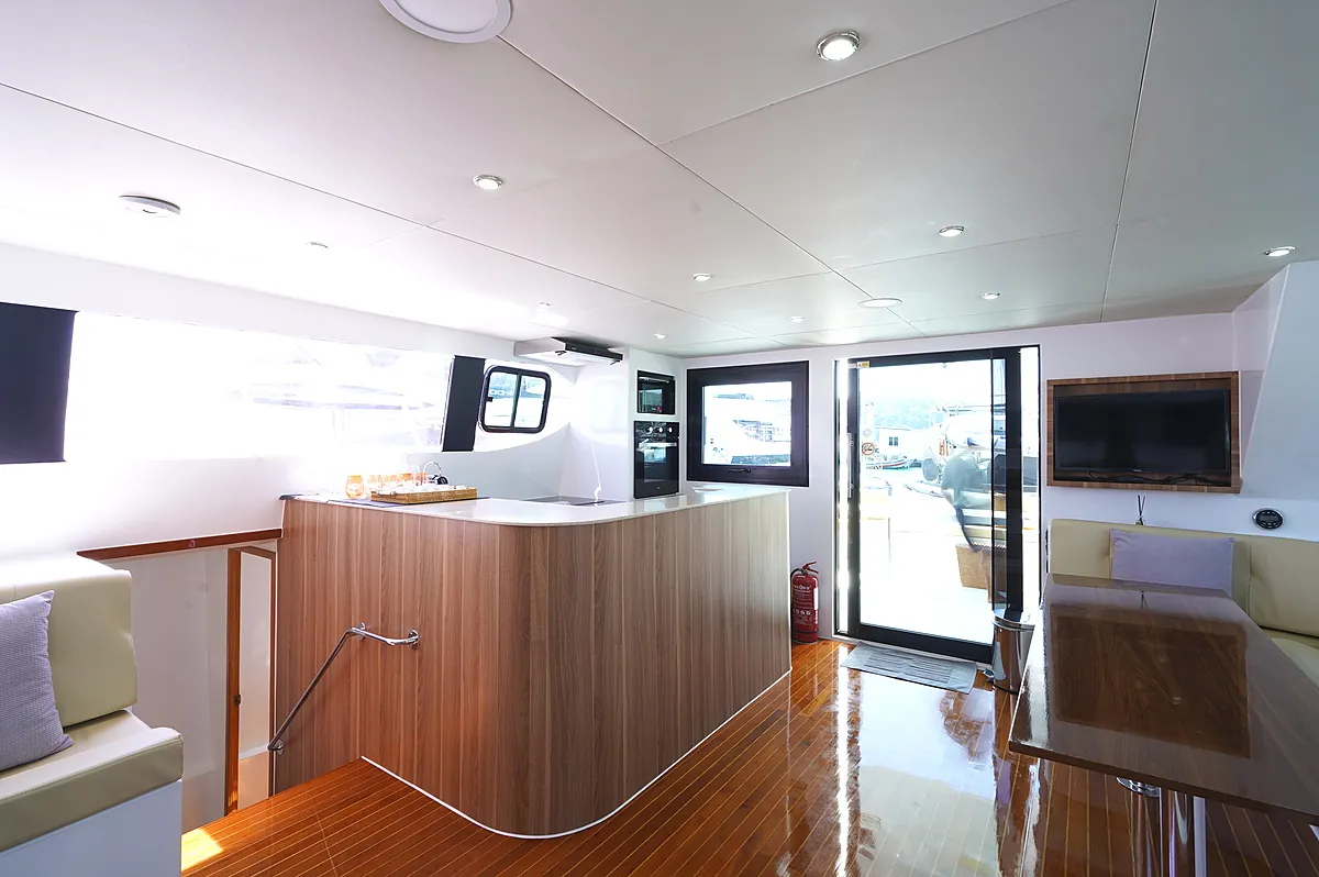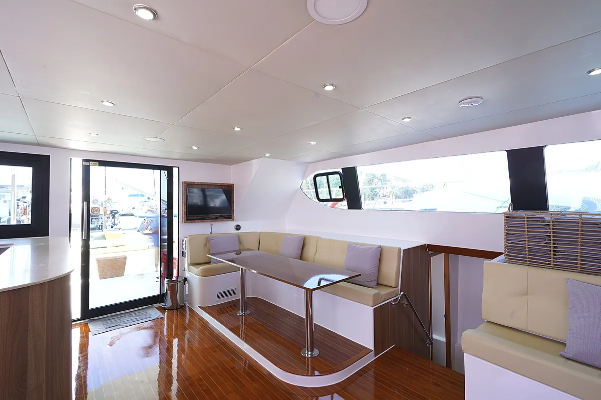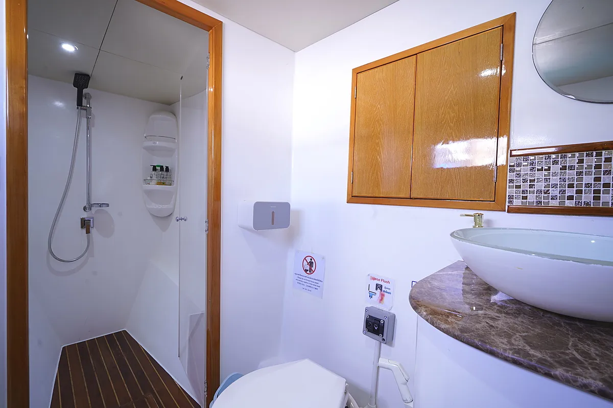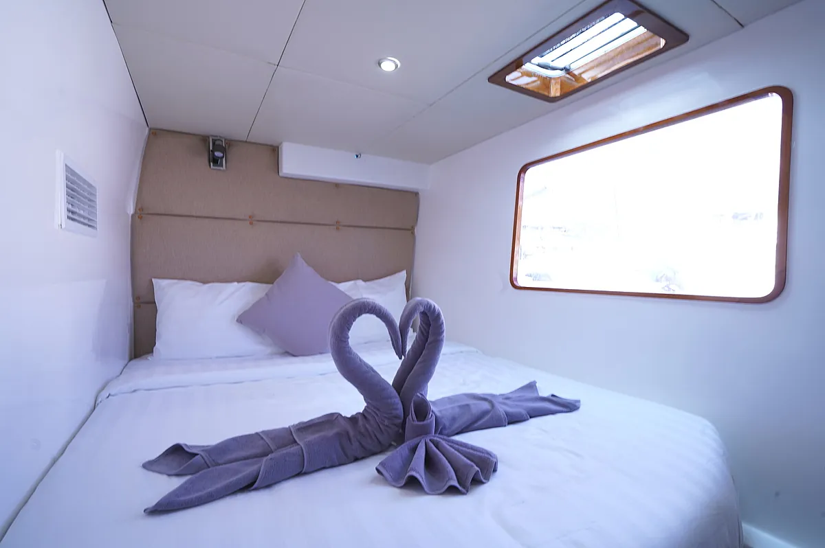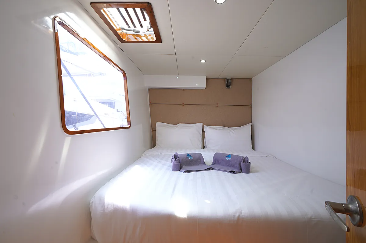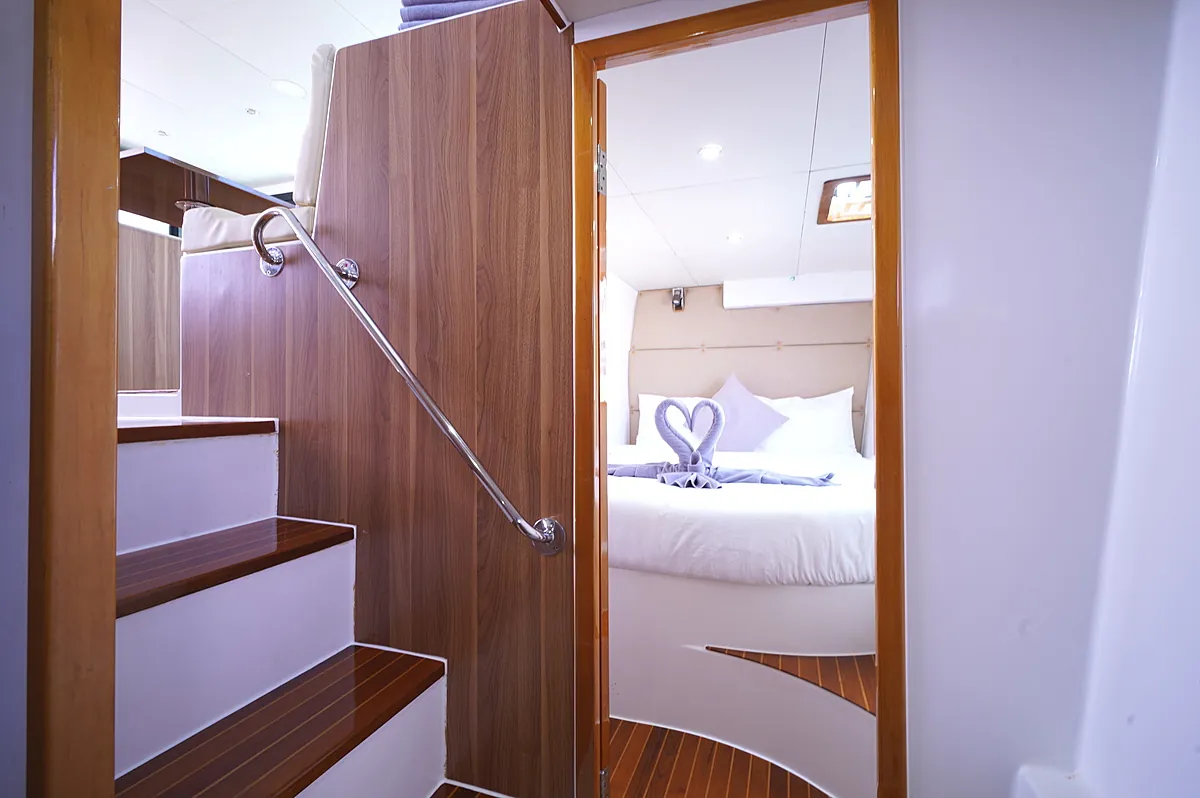 You will cruise with a speed of 10 knots on your trip to Phang Nga Bay (8 hrs) and be impressed by amenities like Flying Bridge, Freshwater Shower, Multiple Decks, Multiple washrooms, Saloon, Submersible bathing platform, Sun-protected area / Awning as well as 2 Paddle boards, Snorkeling masks, Water Slide.